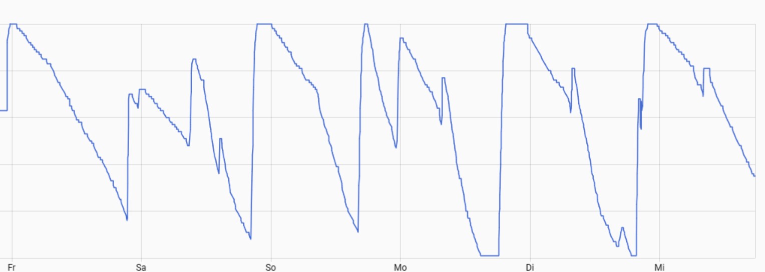An dieser Grafik wird sichtbar, wie die Uhr am ersten Tag noch einen ganzen Tag durchhält und danach nicht mehr. Am letzten Tag der Grafik wurde die Uhr neu aufgesetzt und die Entladekurve wird ist wieder deutlich flacher.