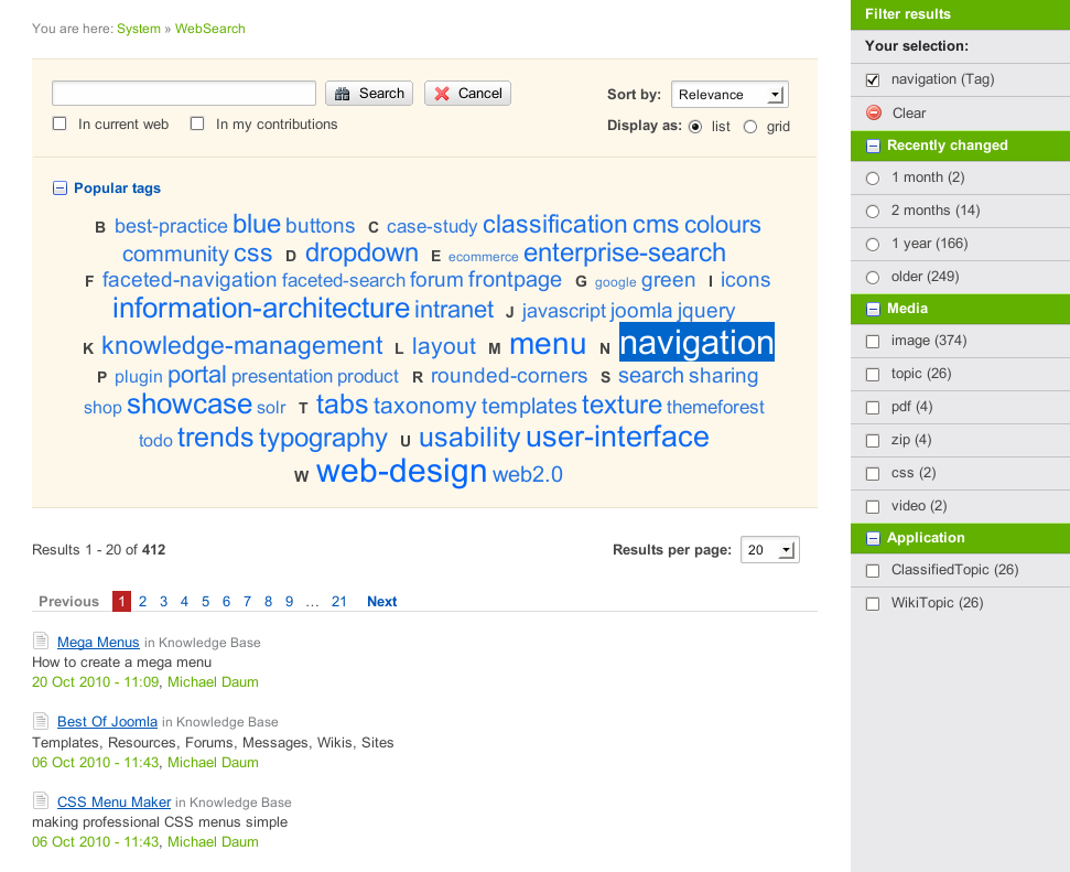 fixed backwards compatibility with pre-unicode Foswiki; bring back solr::queryfields in SolrSearchBaseTemplate; fixed language facet to properly match language tags to their name; improved layout of search results as well as autosuggestion widget; removed workflow facet from default search; fixed icon mapping for topics that don't come with an icon defined in their TopicType; don't try to encode html entities without a code point in utf8; don't remove all macros from topic text, just some; removed dependency on MimeIconsPlugin as we are using fontawesome now; improved formula for sorting results by reference; fixed sorting in ajax-solr; fixed exposing/hiding parameters in ajax-solr; improved findability of content; i.e. when containing stop words only in the title; removed unused /browse search handler from solr config |